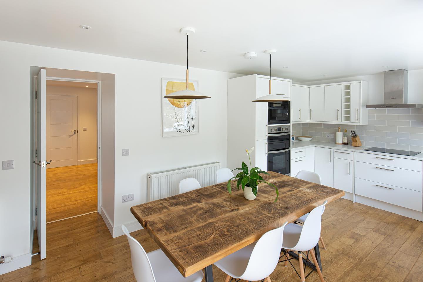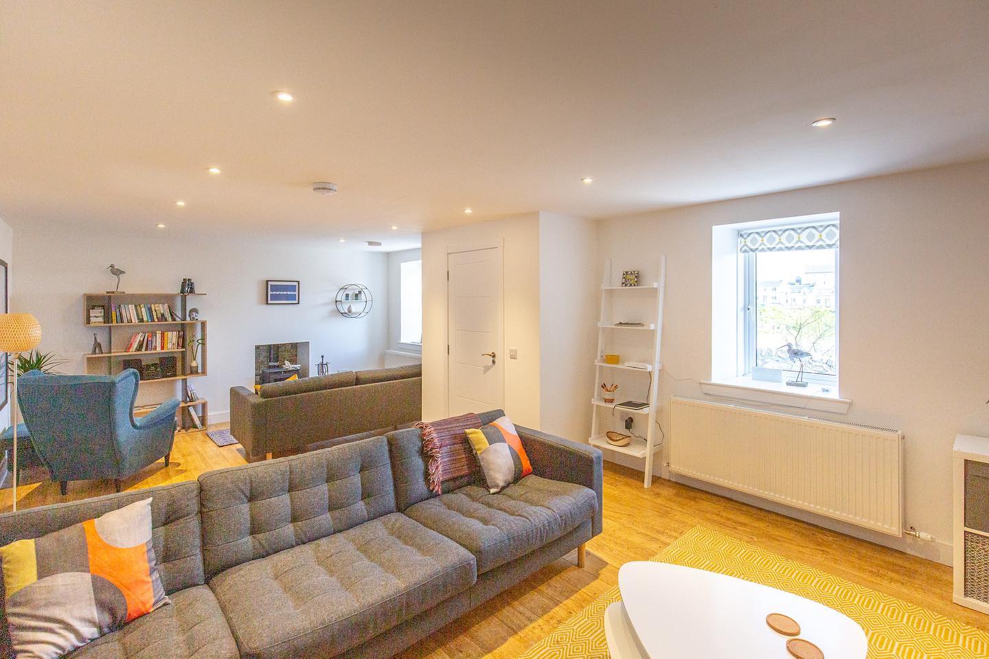 Inside, there is plenty of space to unwind, with two separate lounge areas downstairs offering different places to relax. One provides a cosy setting with a sofa, armchair, fireplace, books, magazines and a stereo system, while the other features a large corner sofa, television and a selection of board games. The kitchen is bright and spacious, fully equipped with a Nespresso machine, microwave, two ovens and all the essentials needed for a comfortable stay. A large reclaimed wood dining table creates a welcoming focal point where everyone can gather together.
