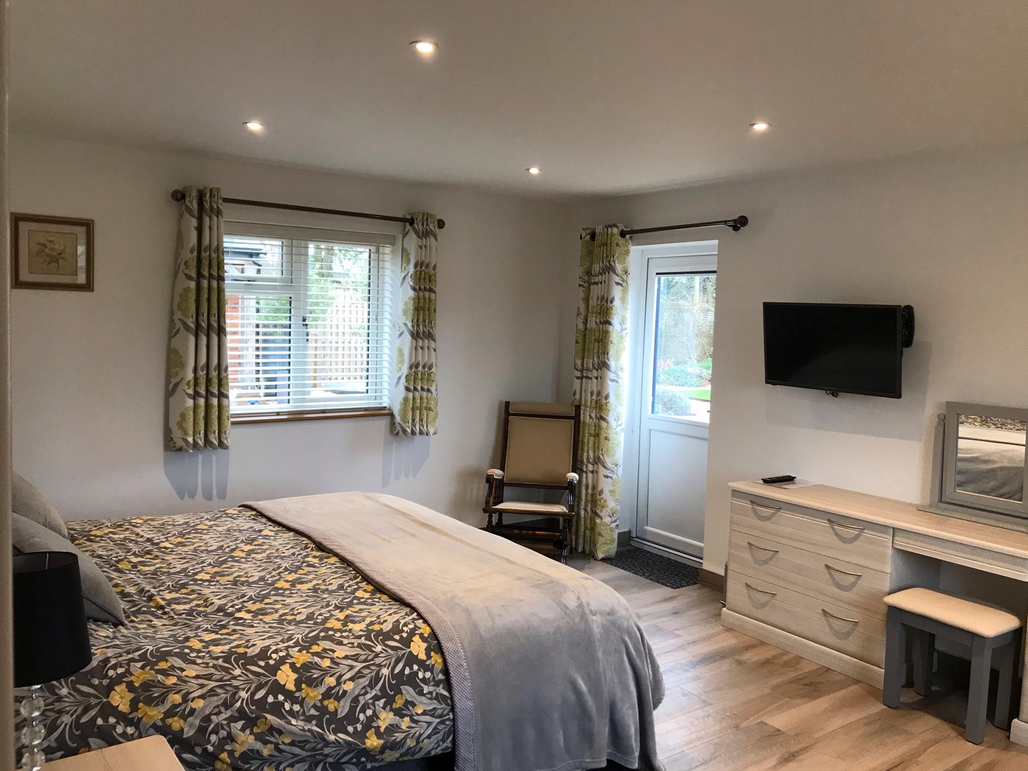 Stable Cottage and Garden Cottage each provide spacious, luxury single-storey accommodation with an open-plan layout designed for comfort and convenience. The fully equipped kitchen features an electric oven, halogen hob, fridge, dishwasher and microwave, flowing seamlessly into the stylish living area where guests can relax on a luxury leather sofa or armchair. The lounge includes Freeview TV, a DVD player and USB charging ports, while a wood-burning stove creates a warm and cosy atmosphere on cooler evenings. The generous bedroom boasts a premium Super King-size Hypnos bed, which can be configured as twin beds on request, along with stunning views over the Hampshire countryside. The contemporary bathroom is well appointed with a large walk-in shower, separate bath and WC, completing this high-quality countryside retreat.