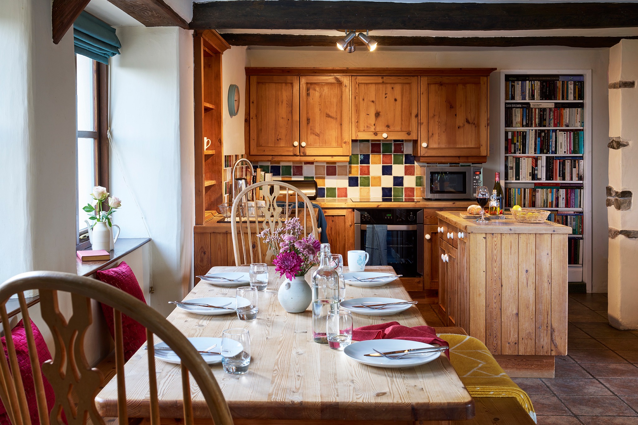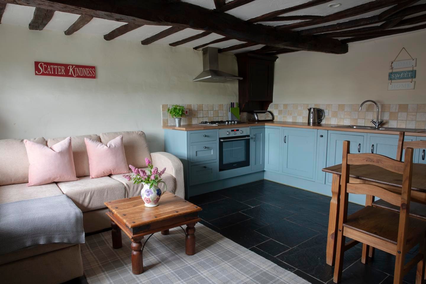 Lavender Cottage is a single-storey stone retreat with two bedrooms and a bright open-plan living space featuring a well-equipped kitchen, dining area and comfortable corner sofa. The master bedroom offers a king-size bed with en-suite bathroom, while the twin room sits beside a second shower room. Modern touches include a built-in fridge/freezer, dishwasher, microwave, fan-assisted oven with ceramic hob, superfast WiFi and a 49” UHD Smart TV. Outside, guests can enjoy the sunken garden and picnic benches. For larger groups, Lavender can connect to Jasmine Cottage via a hidden bookcase, creating accommodation for up to 10 guests plus cots, with two kitchens, two lounges and five bedrooms.