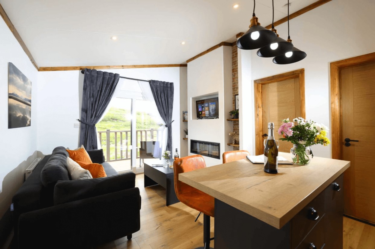 Primrose Cabin is a beautifully designed luxury self-catering retreat for two, offering a comfortable and relaxing space. The cabin features a bright open-plan living area alongside a fully equipped kitchen complete with a hob, microwave, grill and oven combination, fridge and freezer, dishwasher and washing machine, providing everything needed for a convenient stay. The elegant king-size bedroom includes a modern en suite shower room, while large patio windows open onto a covered decked balcony, creating a perfect spot to relax and enjoy the surrounding scenery. Guests are provided with Wi-Fi internet access, satellite/cable television, tea and coffee facilities with a kettle and fresh linen, towels and bathrobes. Complimentary toiletries, a duvet, a full-length mirror and a hair dryer are also included, and an iron and ironing board are available on request.
