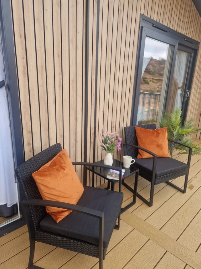 Heather Cabin is a luxury self-catering cabin designed for two people, featuring an open-plan lounge and a fully equipped kitchen with a fridge/freezer, hob, microwave, grill and oven combination, dishwasher and washing machine. The king-size bedroom includes an en suite shower room, and large patio windows provide access to a covered decked balcony. The cabin is fully heated throughout. Amenities include Wi-Fi internet access, satellite/cable television, a kettle with tea and coffee and linen and towels supplied. Complimentary toiletries, a duvet, full-length mirror and hair dryer are provided and an iron and ironing board are available on request.