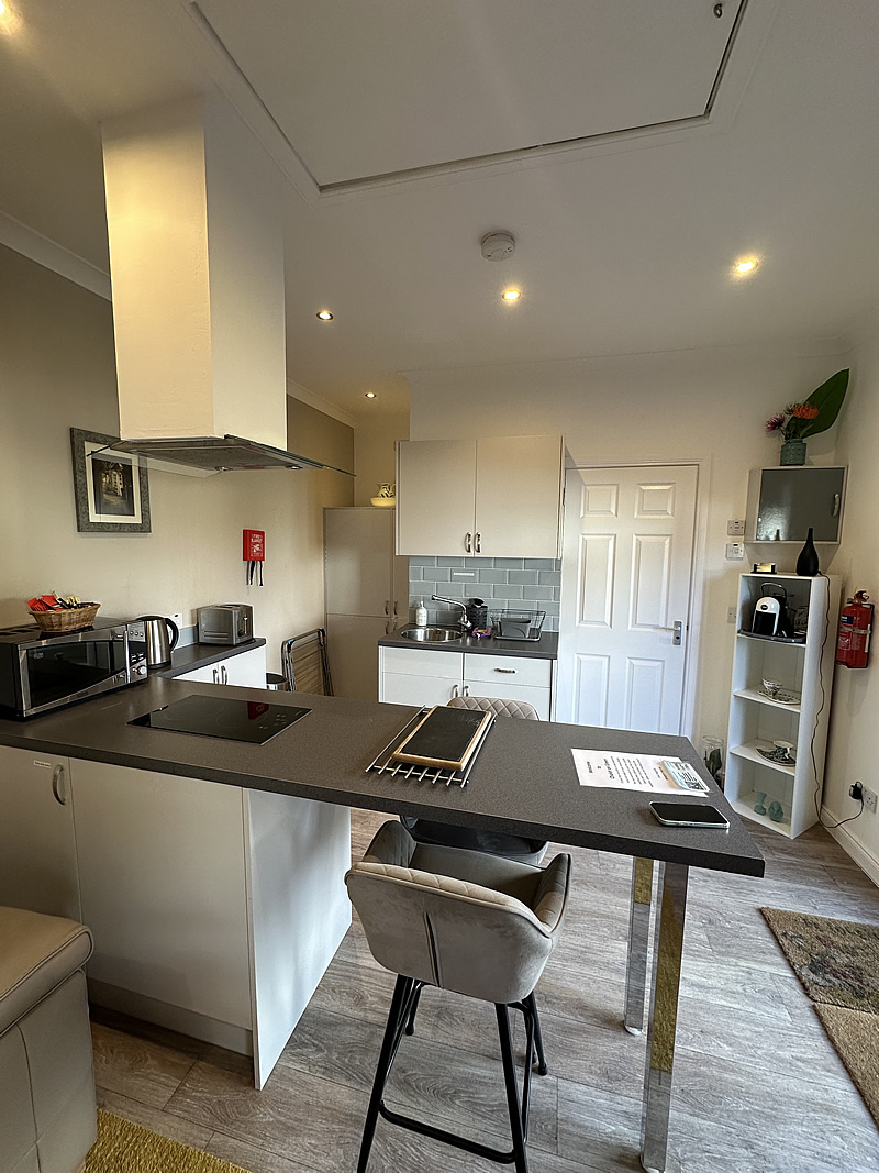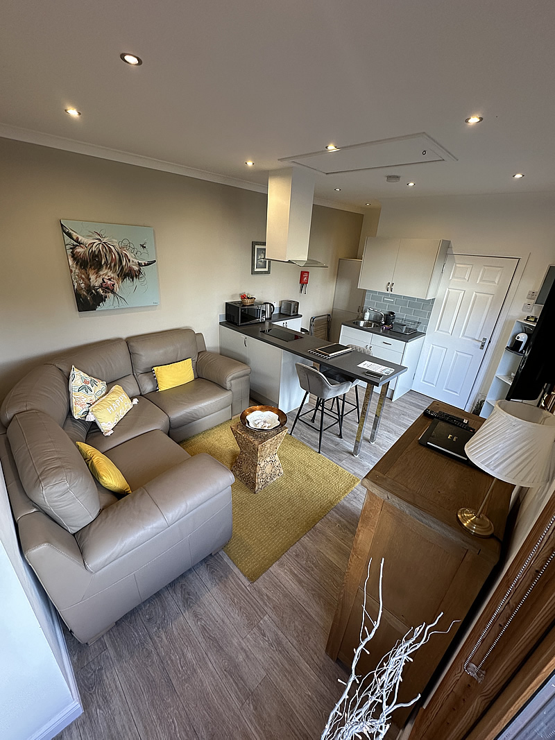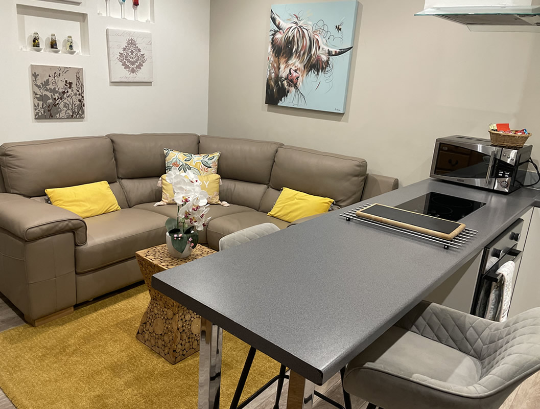 Inside, the chalet offers a bright open-plan living space that brings together a comfortable lounge area with a modern, well-equipped kitchen and breakfast bar. The kitchen includes everything needed for a convenient stay, such as a fan-assisted oven, ceramic two-ring hob, extractor, fridge/freezer, washing machine, microwave and an espresso coffee machine. The living area also features a wall-mounted TV with Freeview, free Wi-Fi, a sofa bed for additional guests and a secure key safe for easy access.