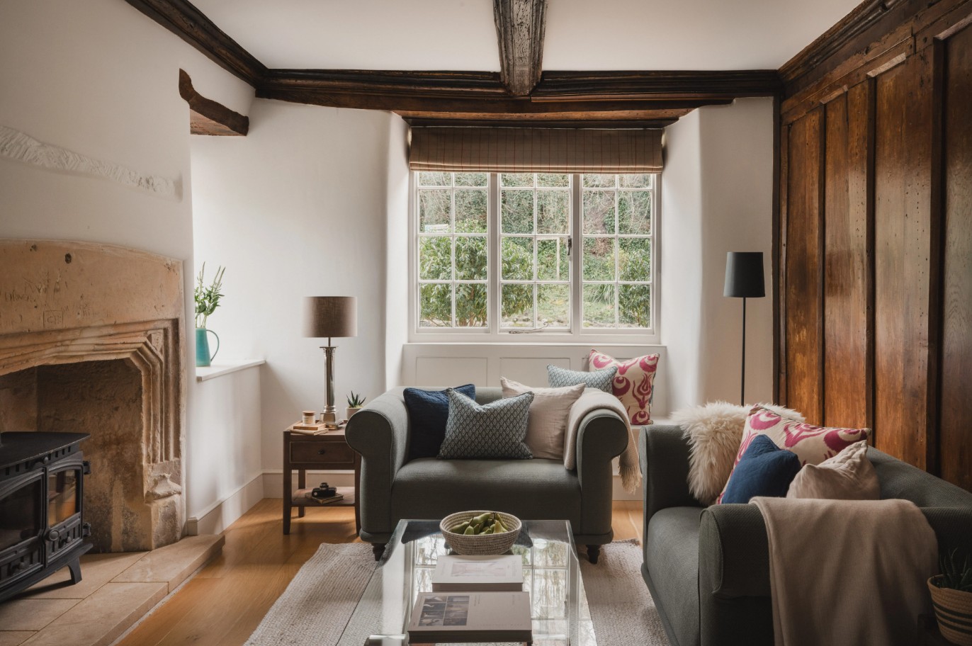 Throughout the house, original features have been carefully retained, including exposed timber beams, aged wood panelling and several fireplaces, with two striking inglenooks that add both charm and a cosy, atmospheric feel.