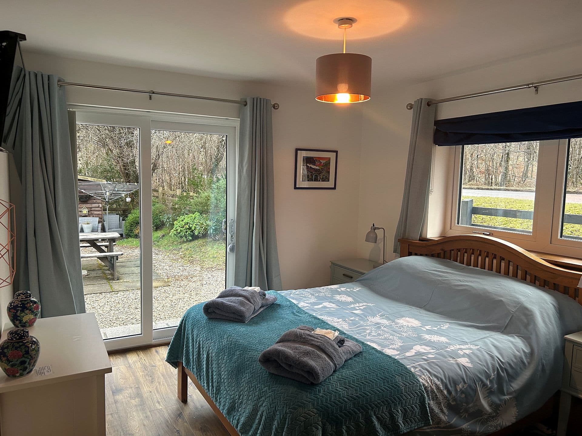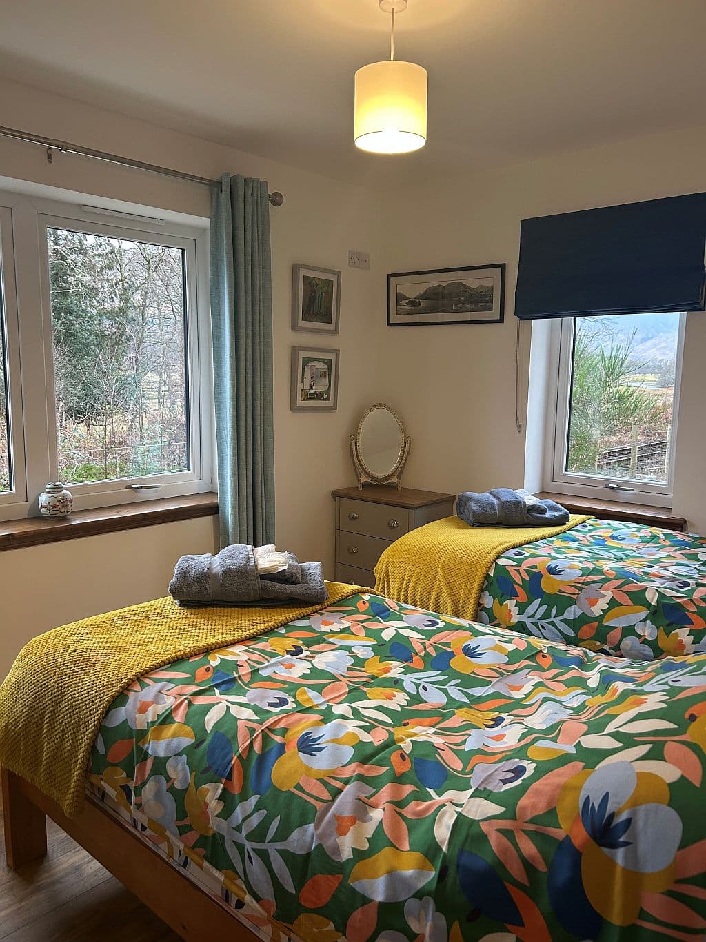 The master bedroom features a king-size bed, an en suite shower room, a wall-mounted Sky TV and views of the river, mountains and railway track. The twin room offers two single beds and similarly impressive views of the loch, mountains and train line, with both bedrooms equipped with fitted wardrobes. There is also a family WC with a large shower, though the cottage does not have a bath.