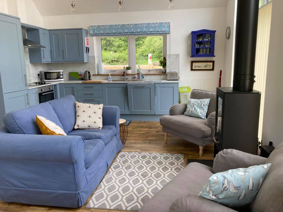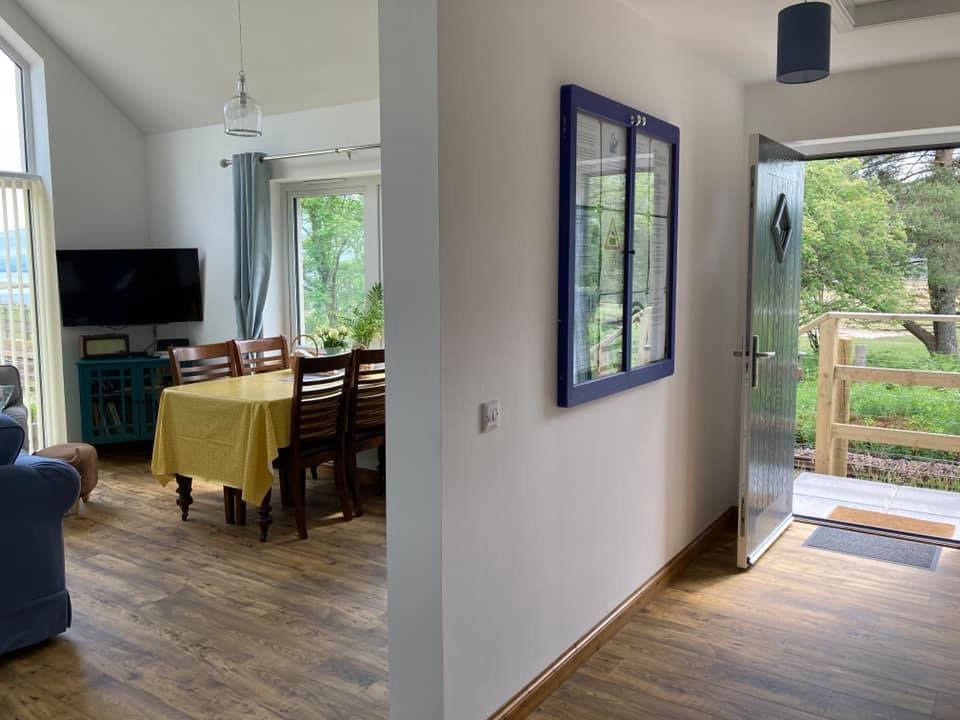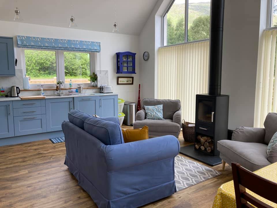 Inside, the main living space is an open-plan area combining a fully fitted kitchen, lounge and dining space. Large 12-foot windows overlook Ben Nevis and Loch Eil, allowing natural light to fill the room and providing the perfect spot to relax in an armchair while watching the Jacobite Steam Train pass by. A separate utility room includes laundry facilities and a small handwashing sink.