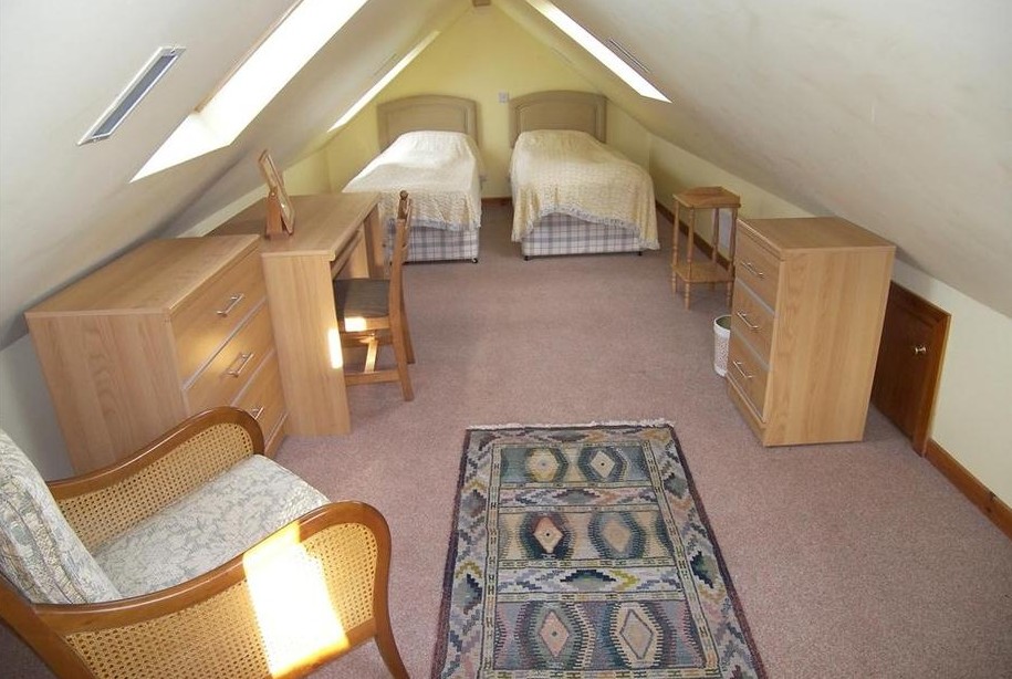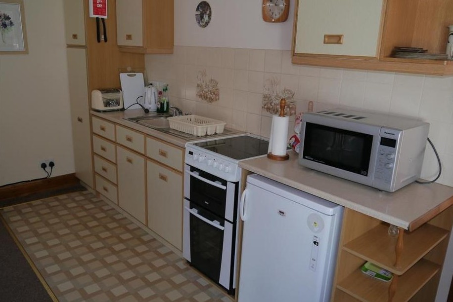 The accommodation is arranged over two levels. Downstairs, there is a comfortable living area with a kitchen and dining space, equipped with a fridge, dishwasher, microwave and television with Freeview, along with comfortable seating. This level also includes a bathroom with a bath, shower and heated towel rails, as well as a bedroom that sleeps two people. Upstairs, the loft bedroom accommodates a further two guests and includes a toilet and Velux windows. Access to the loft is via a well-lit external staircase and guests should note that headroom is limited due to the sloping roof.