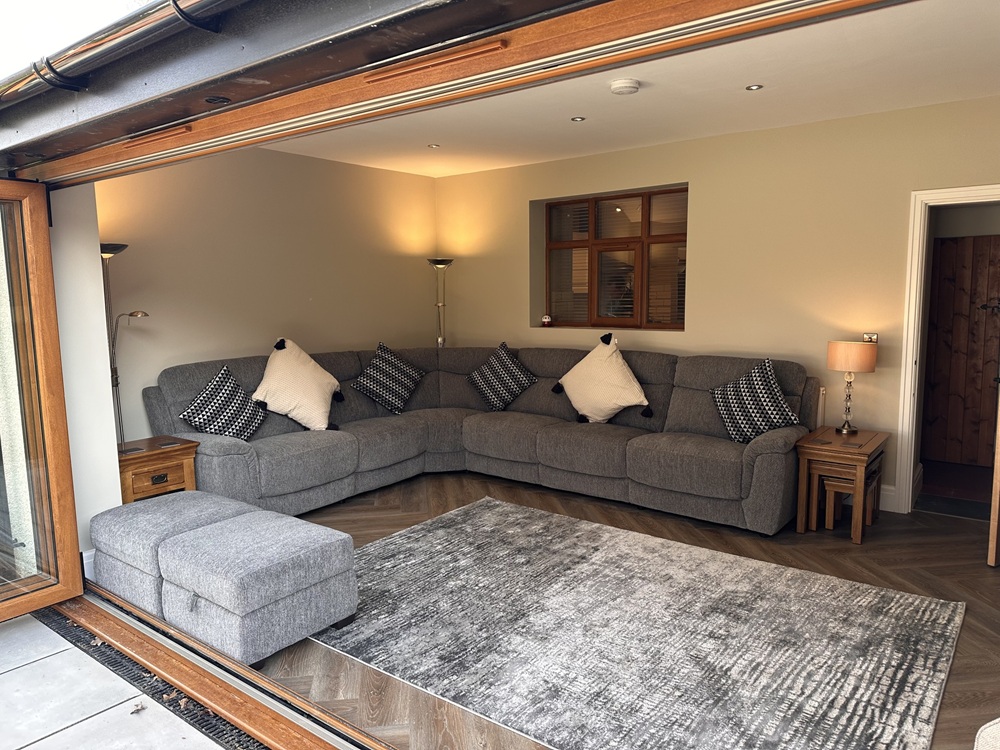 Inside, guests are welcomed into a tastefully decorated front sitting room where reclining sofas invite you to relax in front of a Sky TV offering movies, box sets and sports channels. During the colder months, a woodburning stove adds warmth and atmosphere. There is also a newly added garden sitting room with plush seating, offering stunning views of the Carneddau mountain range behind the village of Rowen.