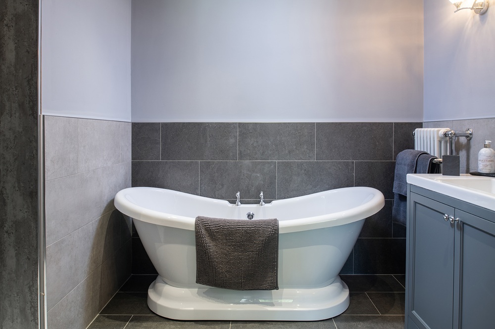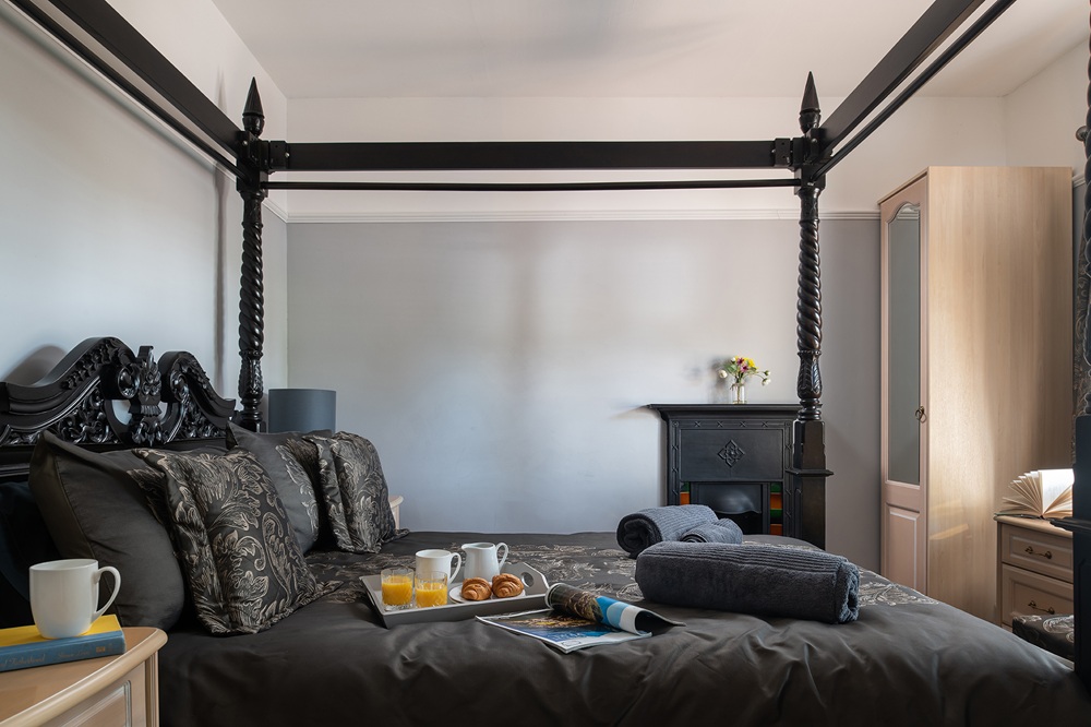 Upstairs, the master bedroom features a king-size four-poster bed, a feature fireplace and an ensuite with a rainfall power shower. Another king-size bedroom also includes a feature fireplace and its own ensuite with a rainfall shower. At the rear of the house are two additional double rooms, each with ensuite bathrooms fitted with electric showers.