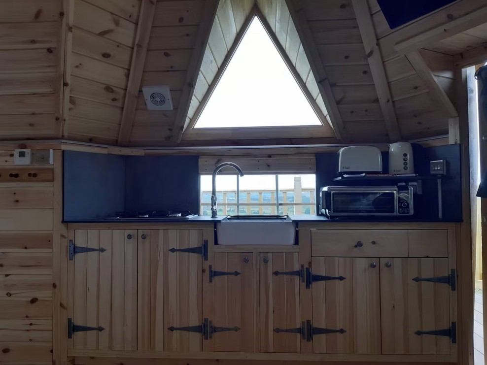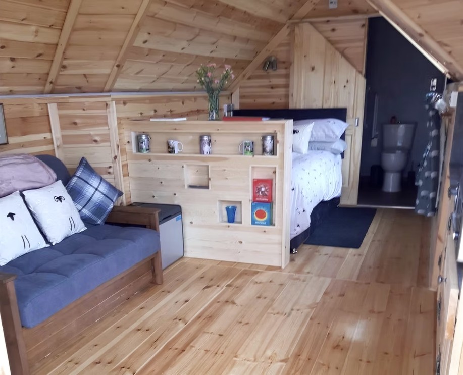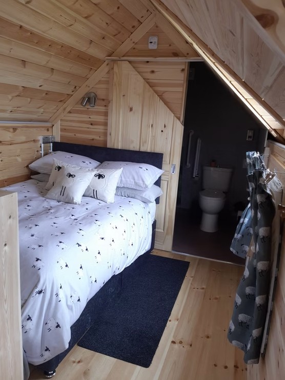 The cabin is designed to accommodate two to four guests and features an open-plan living space with a double bed and a sofa bed. There is a kitchenette for preparing simple meals and a fully accessible wet room fitted with a shower, toilet and basin. Outside, a private decking area provides a relaxing spot where guests can take in the surrounding countryside and enjoy the unique farm setting. For added comfort, locally sourced breakfast hampers can be ordered in advance.