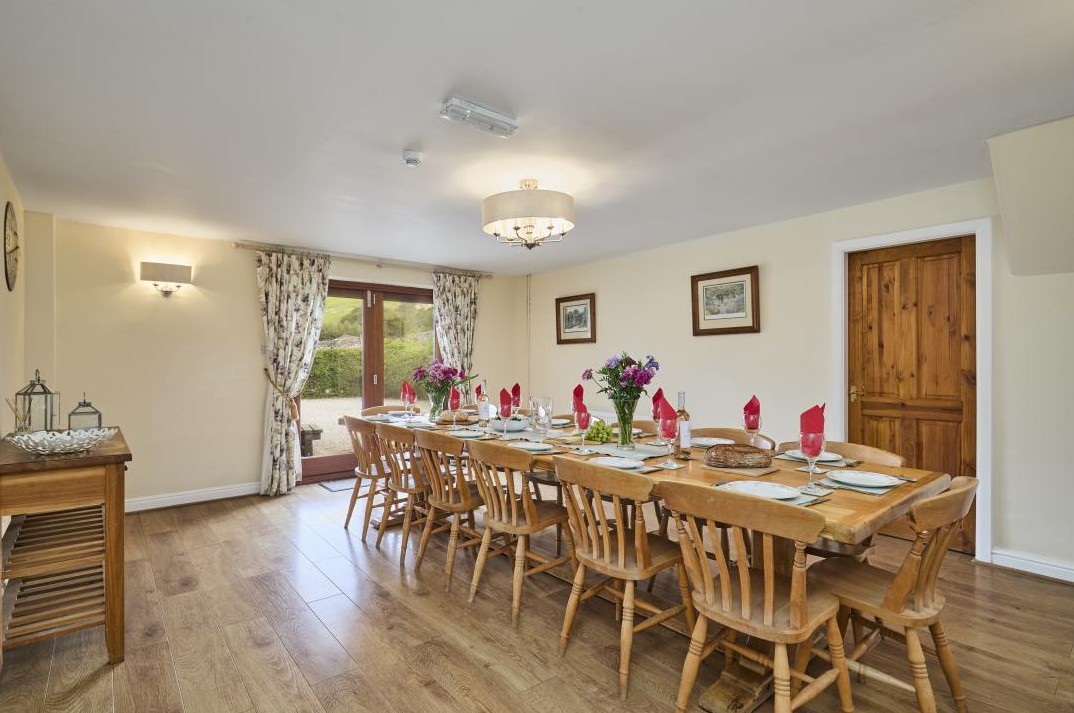 The large dining room features a bespoke table that comfortably seats 14. Large patio doors open out onto a patio area, where a barbecue and outdoor furniture are provided, making it perfect for al fresco dining during the warmer months.