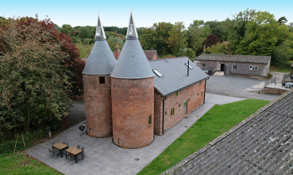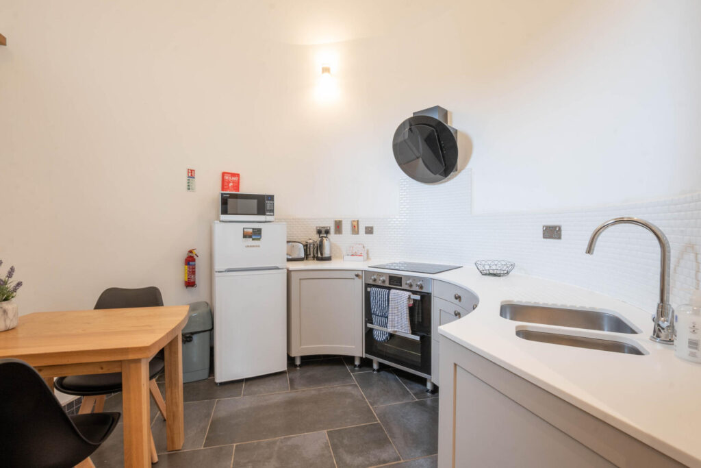 The Loft features a TV and a comfortable sofa within its open studio layout, providing a welcoming space for relaxing, reading, watching TV or playing games. Its unique circular kitchen has been custom built to echo the shape of the original Oast House and comes fully equipped with an electric oven, microwave, sink and all the pots, pans, dishes and cutlery needed for a hassle-free stay. The studio layout also includes a master bedroom area with a king-sized bed and adjoining lounge space, while the bathroom, located just off the sleeping area, offers a shower, freestanding bathtub, sink and toilet.