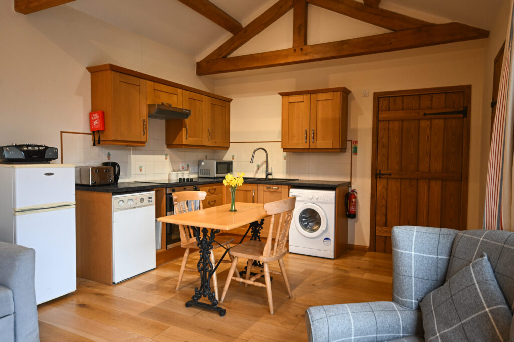 All accommodation is on the ground floor and the bathroom features a wide door and a wet room, making it suitable for wheelchair users and guests with limited mobility. The Tack Room is an ideal holiday cottage for disabled visitors, with hoists available to hire locally and a shower chair provided. The lounge includes a TV, DVD and CD player, along with a large sofa that converts into a double bed for two. The spacious open-plan kitchen and lounge area offers dining for four and the fully fitted kitchen includes an electric cooker, microwave, dishwasher, washing machine and fridge-freezer. The wet room provides ample turning space and the bedroom has a super-king bed that can be separated into two singles. Travel cots and high chairs are available on request. Outside, a large patio area with outdoor seating and ample parking completes the accommodation.