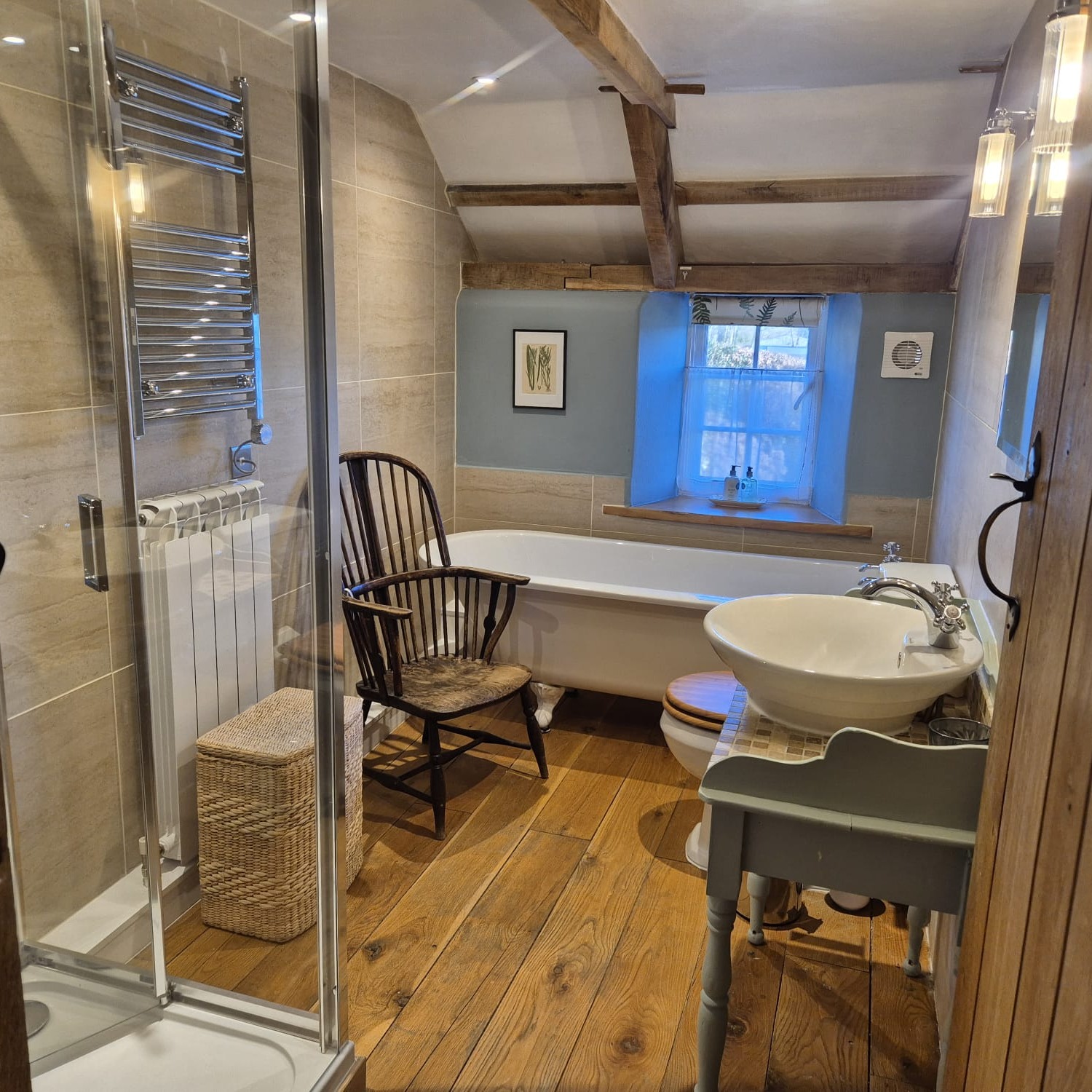 An 18th-century farmworker’s cottage for four with an open fire, roll-top bath, separate shower room and two tiered gardens: a sunny upper lawn and a secluded lower garden reached by stone steps.