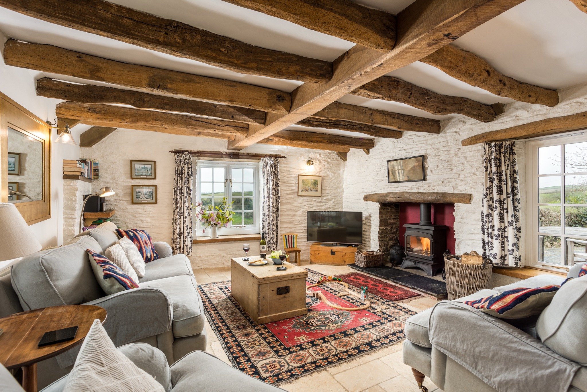 Mostly arranged on one level, three-bedroom Trelugas (for five) pairs a bright, open living space and log burner with panoramic views across patchwork fields. French doors open to a lawned garden that is safely enclosed for little ones and dogs.