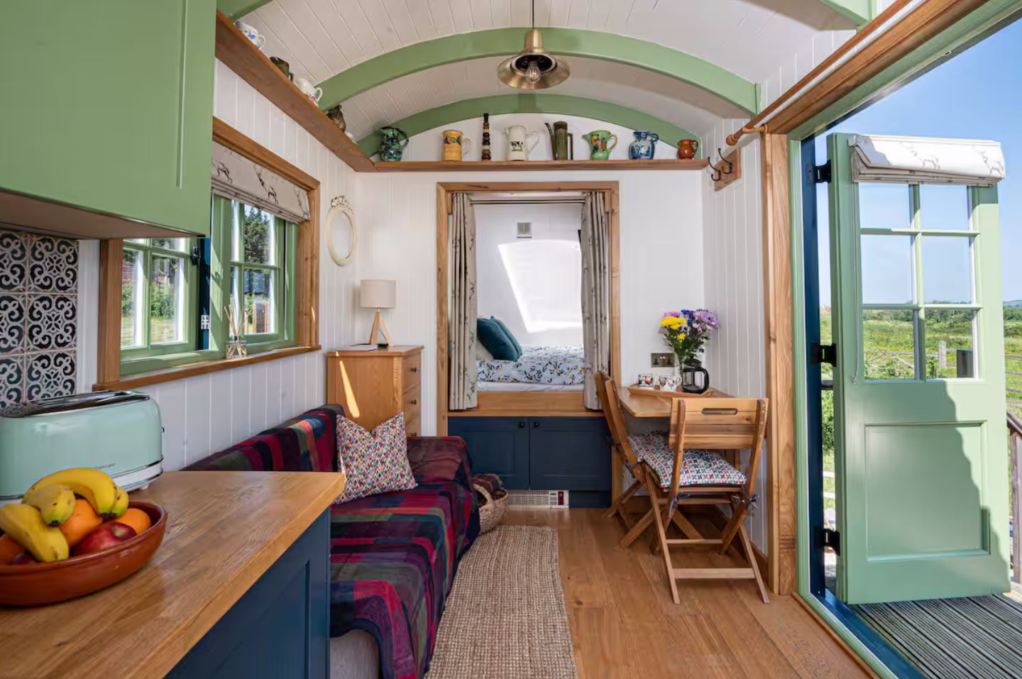 Collie is a cosy, open-plan shepherd’s hut with a king-size bed, en-suite shower room, Smart TV, Wi-Fi and a fully equipped kitchenette including a microwave oven, double hob and fridge with freezer compartment. You'll find an electric heater and a log burner for chillier days, plus all bedding, towels and complimentary tea, coffee and local treats are provided. Outside, unwind in your private wood-fired hot tub, relax on the garden seating as you watch the sunset, or fire up the BBQ/firepit for a meal under the stars. Logs and firelighters are included and there's convenient parking right outside your hut.