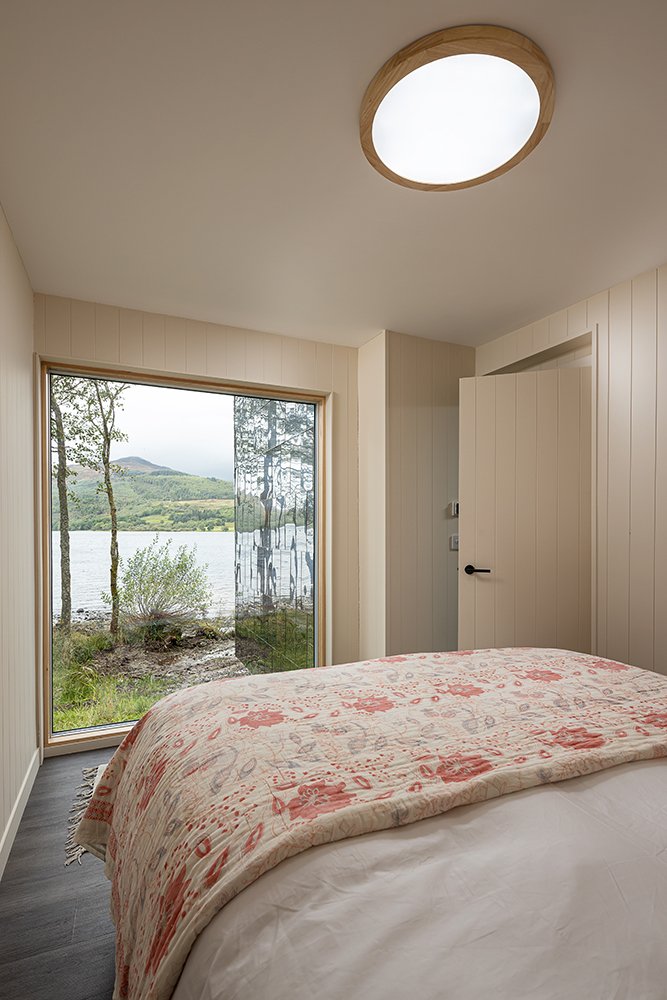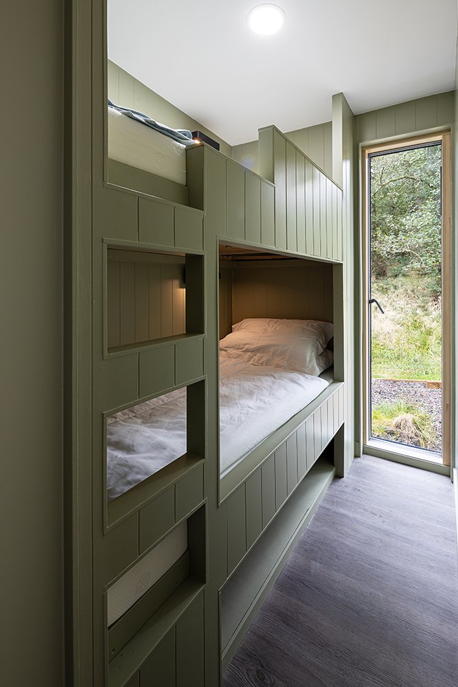 Perched at the property's east end, right beside the Dullater burn, Willow Cabin is a strikingly modern structure, clad in zinc and larch. It accommodates 8 guests with two king-size rooms and two bunk rooms. While the bedrooms are compact and cosy, the cabin's expansive open-plan living area more than compensates with its abundant natural light, comfort and stunning views. During winter, the loch's waves gently lap beneath the glass-fronted balcony, creating an almost aquatic living experience. The large living room includes a wood burner and a dining table extends to seat 12, alongside a fully equipped kitchen featuring a fridge/freezer, microwave, oven and four induction hobs.