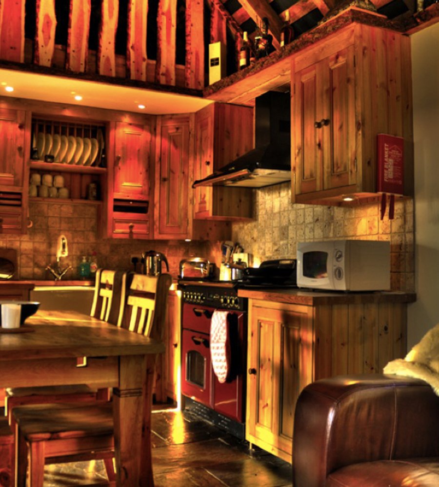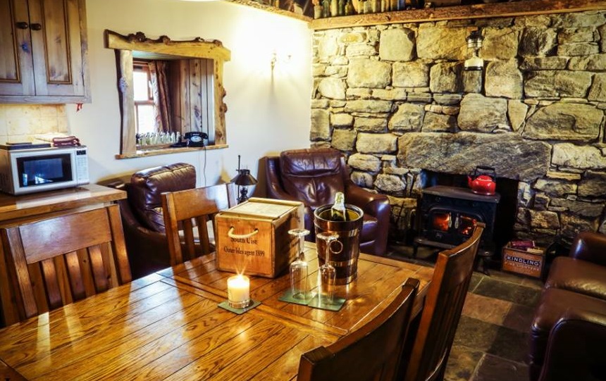 The open plan lounge/dining area comes with a heated slate floor, exposed roof beams, a peat fire, comfy seating, a flat-screen HD TV with Sky, a DVD player and an iPod docking station. A well-equipped kitchen comes with a range of appliances to suit all your needs: a Rangemaster cooker with a Wok burner and griddle, dishwasher, fridge and microwave etc. An adjacent building houses the washer dryer and freezer. A large dining table seats 4 and is perfect for enjoying some home-cooked dishes around.