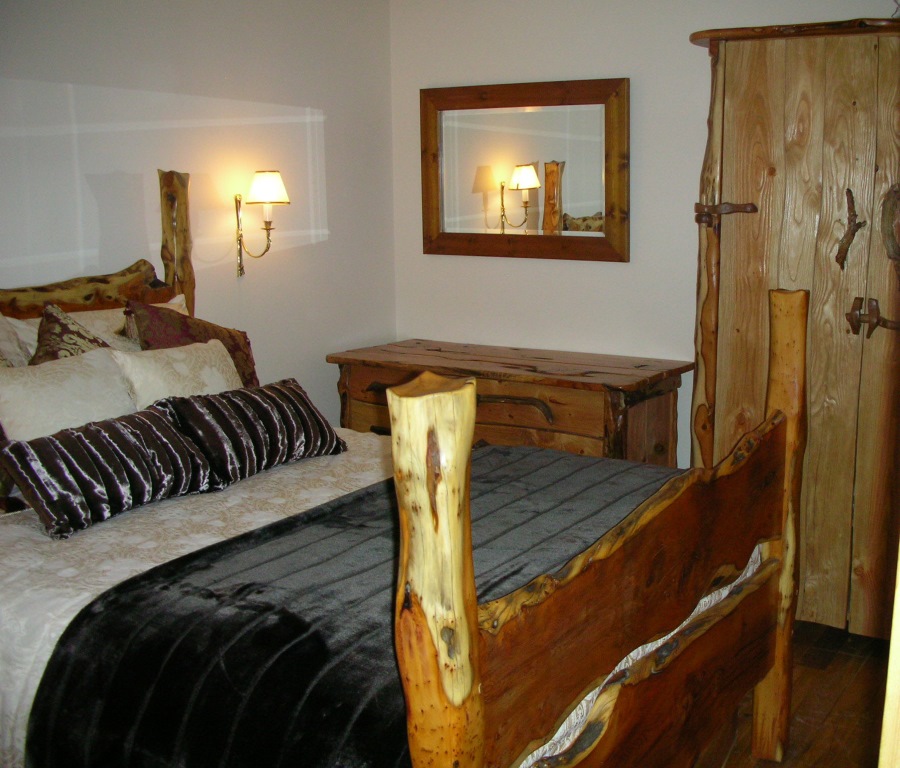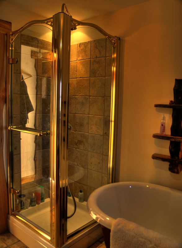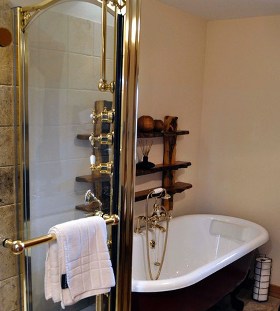The bedroom is floored with hand-cut elmwood and includes a unique rustic hand made double bed with a sumptuous mattress. The large bathroom has a traditional freestanding bath for soaking your troubles away. A separate Daryl Hydra Classic shower is also available.